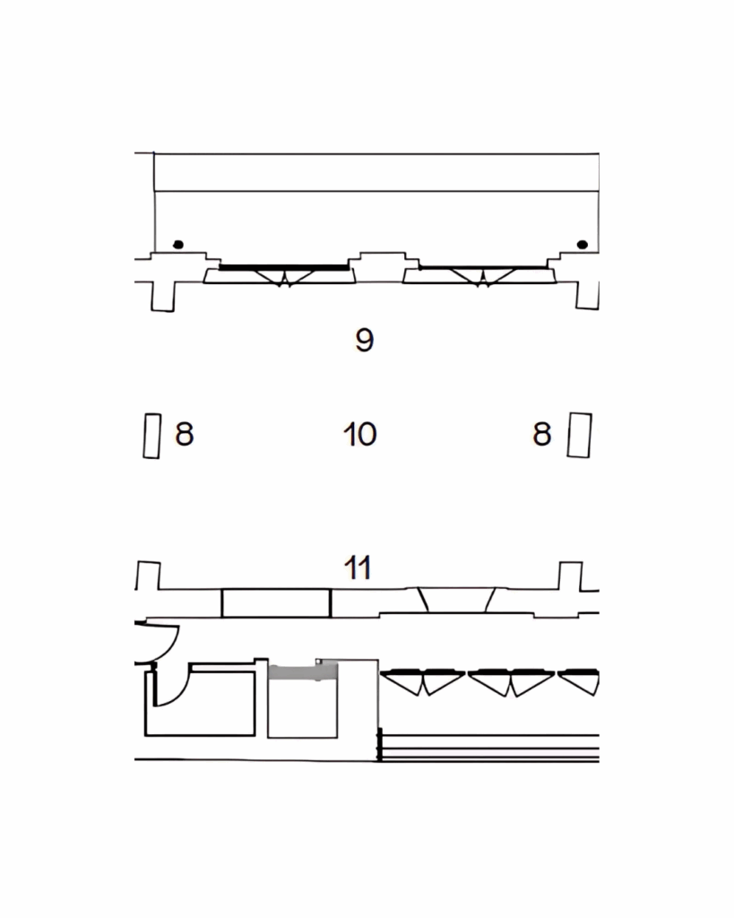 La sala più densa della mostra si apre come un tempio contemporaneo. Due grandi teche (fig 8 e 12) custodiscono dodici Proni di gesso
