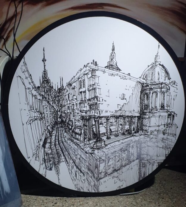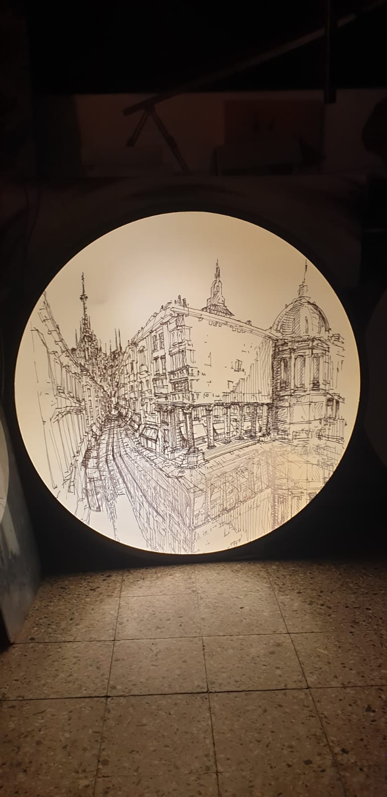 Un disegno al tratto della Milano storica, una visione di Corso Vittorio Emanuele provenendo da San Babila verso l’abside del Duomo con lo scorcio della guglia della Madonnina che illumina la città storica; simultaneamente è un lightbox che quando acceso crea una atmosfera morbida illuminando l’ambiente creando una “finestra” aperta da cui ammirare la visuale.